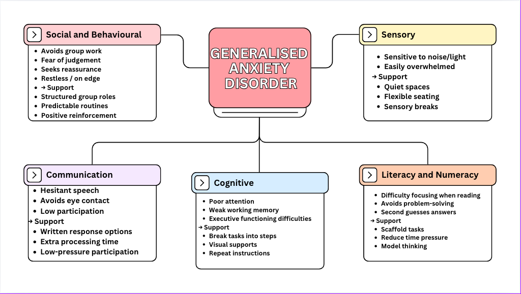 Generalised Anxiety Disorder (GAD) is a mental health condition characterised by excessive and persistent worry that is difficult to control. This worry can interfere with a student’s ability to concentrate, participate, and feel confident in the classroom.
